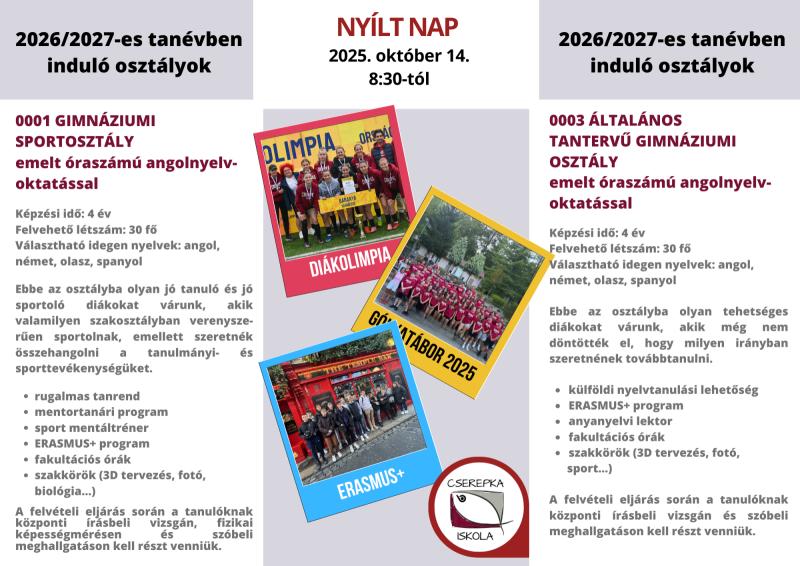 2026. május 8-ig Az iskola megküldi a felvételről vagy elutasításról szóló értesítést a jelentkezőknek, a szülőnek és az általános iskoláknak.