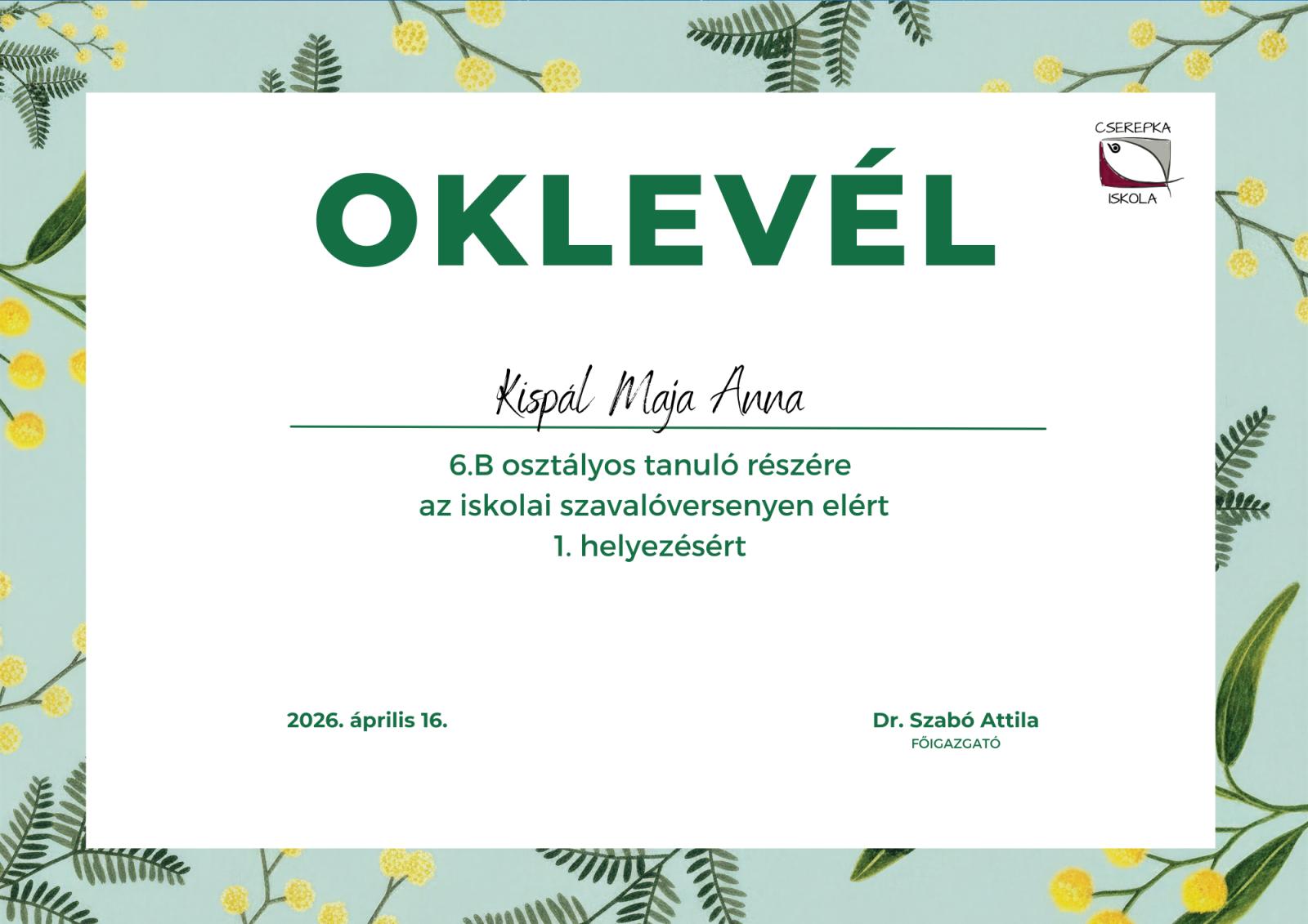A versenyen az alábbi helyezések születtek: I. Kispál Maja Anna (6.B) II. Bakurecz Csenge (7.A) III. Rónavölgyi Zalán (5.B)