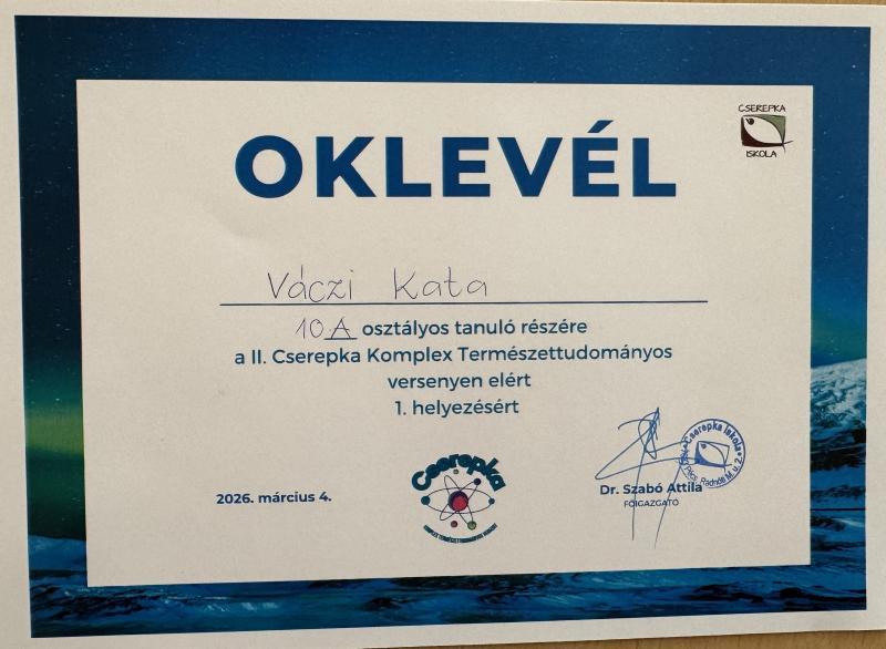 2026. március 4-én rendeztük meg gimnazistáink számára a II. komplex természettudományos versenyt. A megmérettetés célja az volt, hogy középiskolás diákjaink több tudományterületen is összemérhessék tudásukat, valamint elmélyítsék érdeklődésüket a természettudományok iránt.
